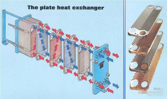板片由不銹鋼薄片沖壓成型,制冷劑和冷卻水在薄片間隔流動,接觸充分,換熱效率高。板式換熱器只需要管殼式換熱器面積的1/2~1/4 即可達到同樣的換熱效果,但阻力損失少、占地小,制造工藝比較復(fù)雜,價格高,易堵塞。