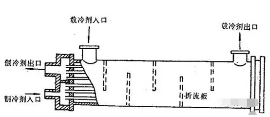 制冷劑走殼程,即制冷劑在管外氣化,下部進液,從上部排氣;液體充滿筒體空間的70~80%。制冷劑一直在蒸發(fā)器內(nèi)沸騰,傳熱面與液態(tài)制冷劑接觸,所以沸騰放熱系數(shù)較大;結(jié)構(gòu)緊湊。
