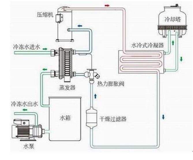 蒸發(fā)器中的液態(tài)制冷劑吸收水中的熱量并開始蒸發(fā),最終制冷劑與水之間形成一定的溫度差,液態(tài)制冷劑亦完全蒸發(fā)變?yōu)闅鈶B(tài)后被壓縮機(jī)吸入并壓縮(壓力和溫度增加),氣態(tài)制冷劑通過冷凝器(風(fēng)冷/水冷)吸收熱量,凝結(jié)成液體,通過熱力膨脹閥(或毛細(xì)管)節(jié)流后變成低溫低壓制冷劑進(jìn)入蒸發(fā)器,完成制冷劑循環(huán)過程。