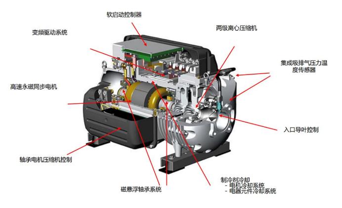 徑向軸承和軸向軸承組成數(shù)控磁軸承讓系統(tǒng)實(shí)現(xiàn)壓縮機(jī)的運(yùn)動(dòng)。部件懸浮在磁襯上無摩擦的運(yùn)動(dòng),磁軸承上的定位傳感器為電機(jī)轉(zhuǎn)子提供超高速的實(shí)時(shí)重新定位,以確保精確定位整個(gè)空調(diào)系統(tǒng)無需潤(rùn)滑油,可避免殼管式換熱器中油膜覆蓋在換熱管上導(dǎo)致?lián)Q熱效率下降的影響,提高系統(tǒng)換熱效率。