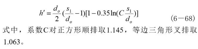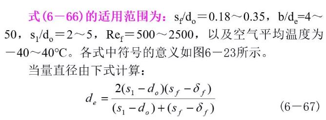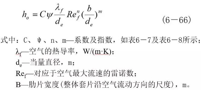 空氣流過(guò)叉排管束時(shí)表面?zhèn)鳠嵯禂?shù)較順排大10%左右,上式乘以1.1即可用于叉排管束空氣側(cè)表面?zhèn)鳠嵯禂?shù)計(jì)算。對(duì)使用波紋翅片和條縫翅片的管束,空氣側(cè)表面?zhèn)鳠嵯禂?shù)目前尚無(wú)簡(jiǎn)單準(zhǔn)確的計(jì)算式。實(shí)踐表明,采用波紋翅片和條縫翅片時(shí),空氣側(cè)表面?zhèn)鳠嵯禂?shù)一般較平翅片分別大20%和60%以上,若欲計(jì)算波紋翅片管或條縫翅片管管束空氣側(cè)表面?zhèn)鳠嵯禂?shù),可先按平套片計(jì)算,然后再分別乘以1.2或1.6,即可作為波紋翅片管束和條縫翅片管束空氣側(cè)表面?zhèn)鳠嵯禂?shù)的近似值。
