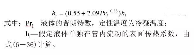 對(duì)于制冷劑蒸氣在水平管內(nèi)流動(dòng)凝結(jié)換熱,目前公認(rèn)較好的通用關(guān)聯(lián)式為夏(M.M.Shah)提出的關(guān)聯(lián)式,該式對(duì)應(yīng)實(shí)驗(yàn)數(shù)據(jù)的實(shí)驗(yàn)管徑為6~40mm,基本上覆蓋了制冷換熱器的常用管徑范圍。水平管內(nèi)蒸氣全部凝結(jié)時(shí),平均表面?zhèn)鳠嵯禂?shù)的關(guān)聯(lián)式為: