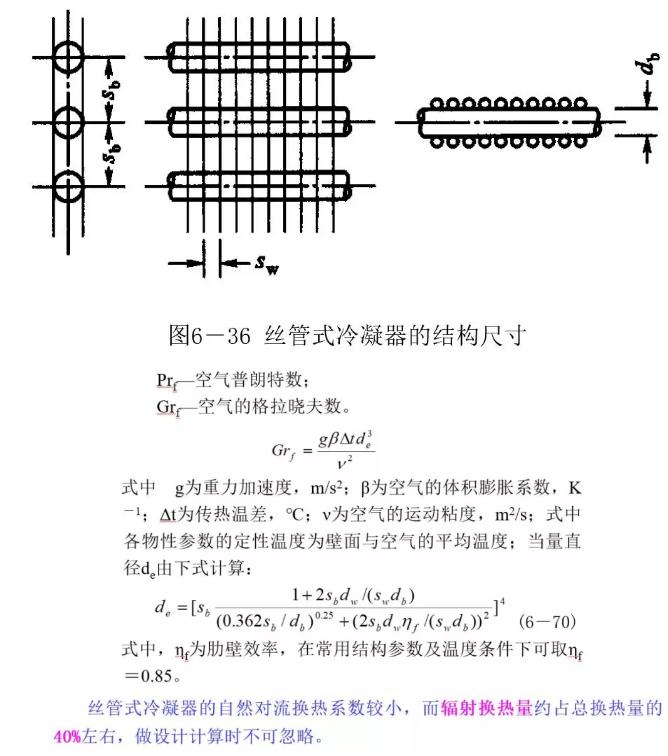 絲管式冷凝器的幾何尺寸如圖6-36所示。下列公式可用于計(jì)算其空氣側(cè)的自然對(duì)流表面換熱系數(shù):