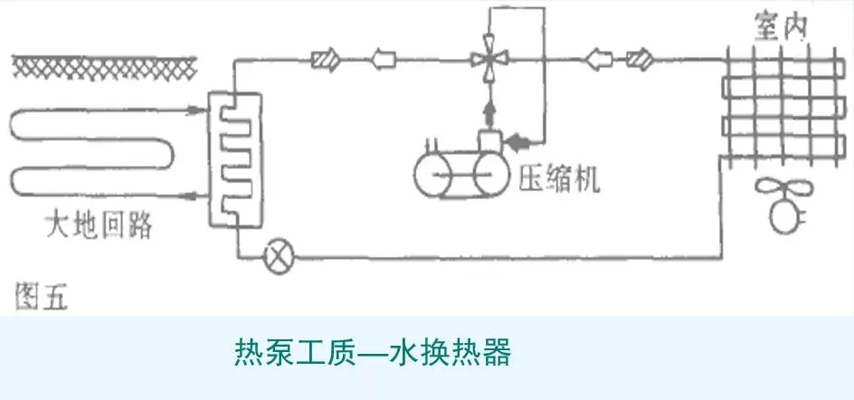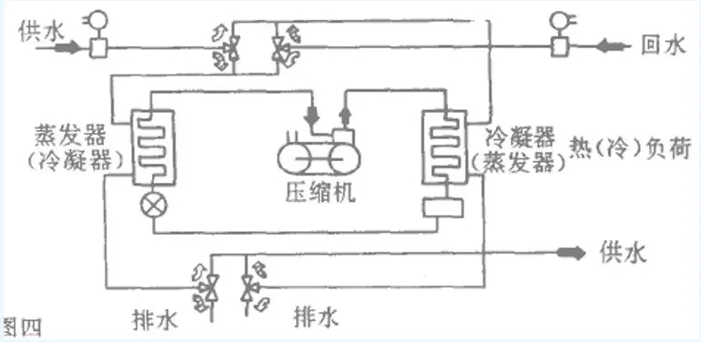 利用切換工質(zhì)回路來實現(xiàn)制熱或制冷運行。為了避免污染封閉冷水系統(tǒng),需要間接地通過一個換熱器來供水,或利用封閉回路的冷凝器水系統(tǒng)。