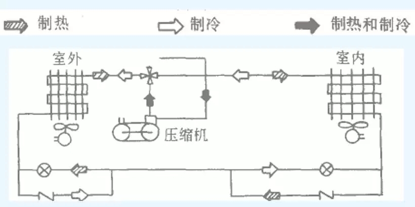 在該系統(tǒng)中,一個換熱盤管作為蒸發(fā)器而另一個作為冷凝器。在制熱循環(huán)時,被調(diào)的空氣流過冷凝器而室外空氣流過蒸發(fā)器。工質(zhì)換向后則成了制冷循環(huán),被調(diào)空氣流過蒸發(fā)器而室外空氣流過冷凝器。