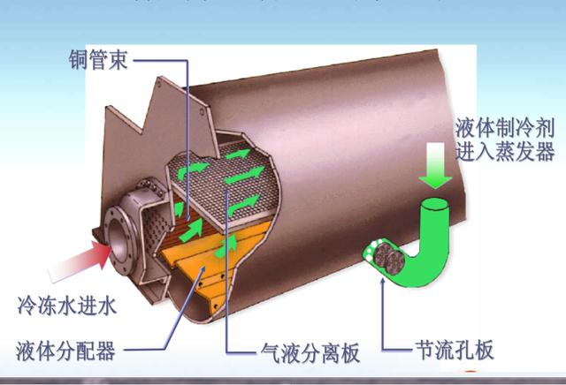 滿液式殼管器:1.水在銅管里面流動(dòng),冷媒在銅管外面流動(dòng);2.有節(jié)流裝置,不用膨脹閥節(jié)流。