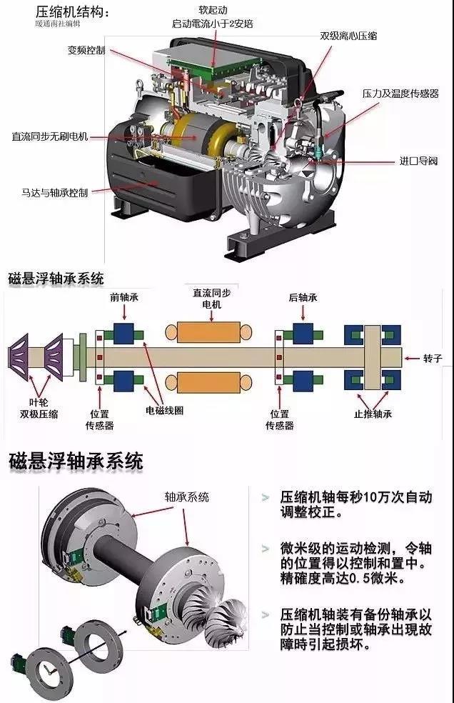 磁懸浮離心式冷水機組的核心是磁懸浮離心壓縮機,其主要由葉輪、電機、磁懸浮軸承、位移傳感器、軸承控制器、電機驅動器等部件組成。磁懸浮軸承是一種利用磁場,使轉子懸浮起來,從而在旋轉時不會產(chǎn)生機械接觸,不會產(chǎn)生機械磨擦,不再需要機械軸承以及機械軸承所必需的潤滑系統(tǒng)。在制冷壓縮機中使用磁懸浮軸承,所有因為潤滑油而帶來的問題將不復存在。