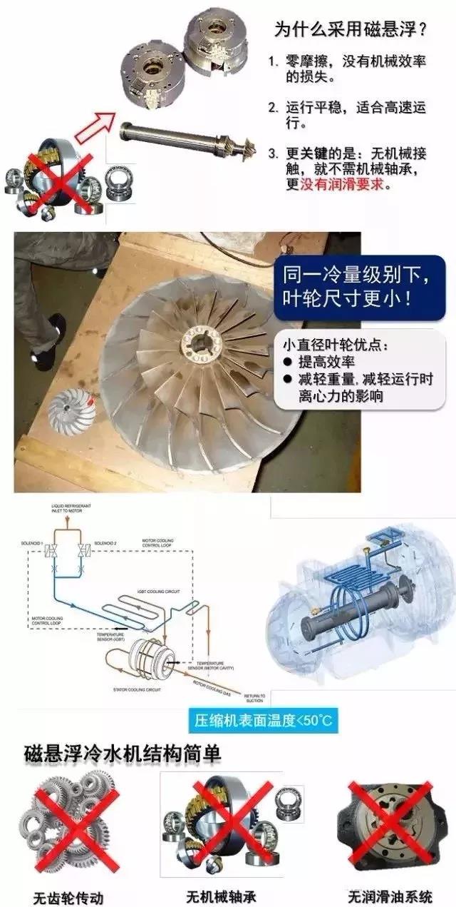 磁懸浮離心式冷水機組高轉速帶來的好處是葉輪直徑可減小至5~8cm。磁懸浮壓縮機的體積與重量僅為相同冷量常規(guī)壓縮機的20%左右,節(jié)省占地面積,也使吊裝更為方便;