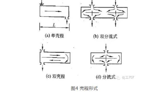 常用的有1、2管程或4管程,管程數(shù)增加,管內(nèi)流速增加,但是管內(nèi)流速要受到管程壓力降的限制。殼程形式分為單殼程、雙分流式、雙殼程和分流式。