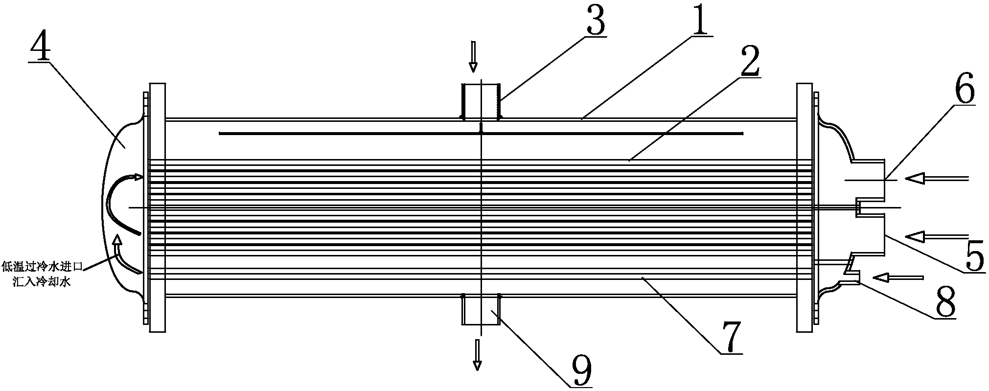 廣東捷邦本實用新型公開了一種管殼式冷凝器下端加設(shè)過冷度段,其特征在于,包括管殼、在管殼內(nèi)設(shè)有的換熱列管、在管殼上設(shè)有的制冷劑進氣口和制冷劑出液口、在管殼一端上設(shè)有與換熱列管連通的循環(huán)腔,及在管殼一端上設(shè)有與換熱列管連通的冷卻水進口和冷卻水出口;所述的管殼低層設(shè)置有與循環(huán)腔連通的過冷度段銅管;所述的管殼端部上設(shè)有與過冷度段銅管連通的低溫過冷水進口。本實用新型具有提升中央空調(diào)機組工作能效的效果。