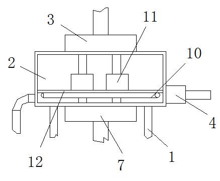 圖中:1連接腳柱、2支撐箱體、3第一轉(zhuǎn)換接頭、4第一抽泵、5第二抽水泵、6連接蓋、7第二轉(zhuǎn)換接頭、8連接管殼、9換熱導(dǎo)管、10散熱管、11壓縮機(jī)、12安裝底板。