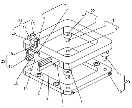 圖中:1固定座、2出水管、3冷媒管、4管殼、5第一鎖緊器、6第一鎖孔、7定位槽、8緊固件、9減震座、10減震支架、11第二鎖孔、12第二鎖緊器、13把手、14安裝架、15過濾網(wǎng)、16滑槽、17滑軌、18進(jìn)水管、19過濾盒、20第一鎖緊機(jī)構(gòu)、21卡接機(jī)構(gòu)、22減震機(jī)構(gòu)、23第二鎖緊機(jī)構(gòu)、24過濾裝置、25滑動(dòng)機(jī)構(gòu)。