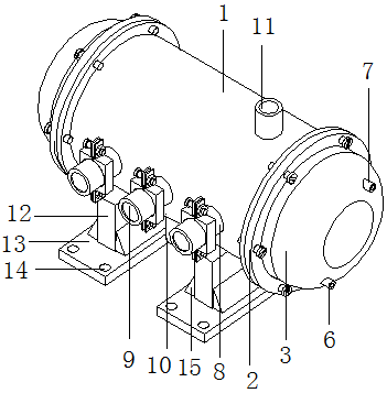 作為本實(shí)用新型的一種優(yōu)選技術(shù)方案,所述圓筒殼的弧面底端設(shè)有兩個(gè)均勻分布的支座,支座的底端設(shè)有底板,底板的上端四角設(shè)有均勻分布的固定螺紋孔,支座的兩側(cè)底端設(shè)有加強(qiáng)筋,加強(qiáng)筋的底端與底板的上表面固定連接,通過螺栓將底板上的固定螺紋孔與安裝部位螺紋孔螺紋連接,實(shí)現(xiàn)裝置牢固安裝固定。