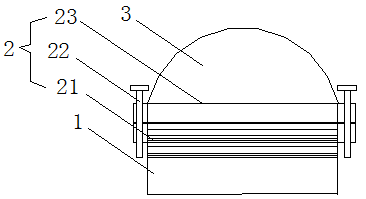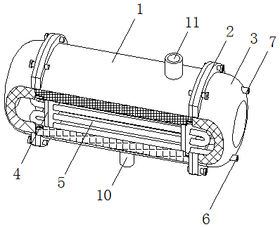 與現(xiàn)有技術(shù)相比,本實(shí)用新型的有益效果是:本多功能清潔型蒸發(fā)器,結(jié)構(gòu)簡(jiǎn)單,由于兩個(gè)對(duì)稱分布的固定環(huán)板上端螺紋孔通過固定螺栓螺紋連接,實(shí)現(xiàn)對(duì)接頭殼內(nèi)部的便利清理維護(hù),通過管口接管便于對(duì)圓筒殼及換熱管清潔處理,通過螺栓將底板上的固定螺紋孔與安裝部位螺紋孔螺紋連接,實(shí)現(xiàn)裝置牢固安裝固定,給使用者的使用帶來了極大的便利,能夠通過視液鏡查看換熱管外觀情況是否臟污嚴(yán)重,判斷冷凍水水質(zhì)是否需要更換,停機(jī)清洗時(shí),松開固定螺母與鎖緊螺桿螺紋連接,松開鎖緊螺桿與弧形壓塊的上端螺紋孔的螺紋連接,將插筒從管口接管的前端插槽內(nèi)拔出,能更方便的清洗換熱管壁臟污,查看換熱管壁清洗的清潔情況,膠圈和防腐蝕套筒起到金屬隔絕,能夠很好的避免雙金屬相互腐蝕情況的發(fā)生,減輕了人員的維護(hù)負(fù)擔(dān),保證了制冷效果,延長(zhǎng)了使用壽命,提升了蒸發(fā)器的使用效率。