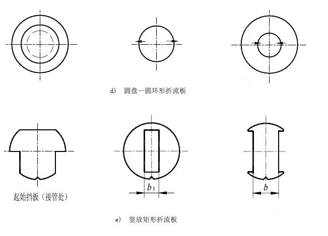 d)矩形折流板(圖e):矩形折流板可橫放,也可豎放,而橫放一般用于殼程介質(zhì)為氣相時(shí),豎放用于殼程介質(zhì)為液相或有冷凝液的場(chǎng)合。這兩種形式通常在大直徑和大流量情況下采用。