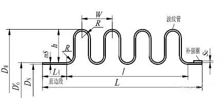 U 形膨脹節(jié)主要由波形管、直邊段兩部分組成,需要時(shí)還可能設(shè)內(nèi)襯筒,加強(qiáng)環(huán)等,見圖所示: