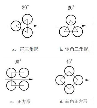 3) 轉(zhuǎn)角排列,一般用于換熱管正方形排列,可使流體形成湍流,以提高傳熱效率。