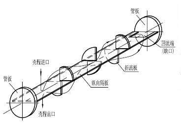 在殼程內(nèi)安裝一平行于換熱管軸線的矩形平板,即縱向隔板,將殼程一分為二,即雙殼程,見圖所示。這種結(jié)構(gòu)可以提高殼程物料流速,改善傳熱效果,即提高傳熱系數(shù),從經(jīng)濟(jì)角度,一臺(tái)雙殼程換熱器比兩臺(tái)單管程換熱器便宜。