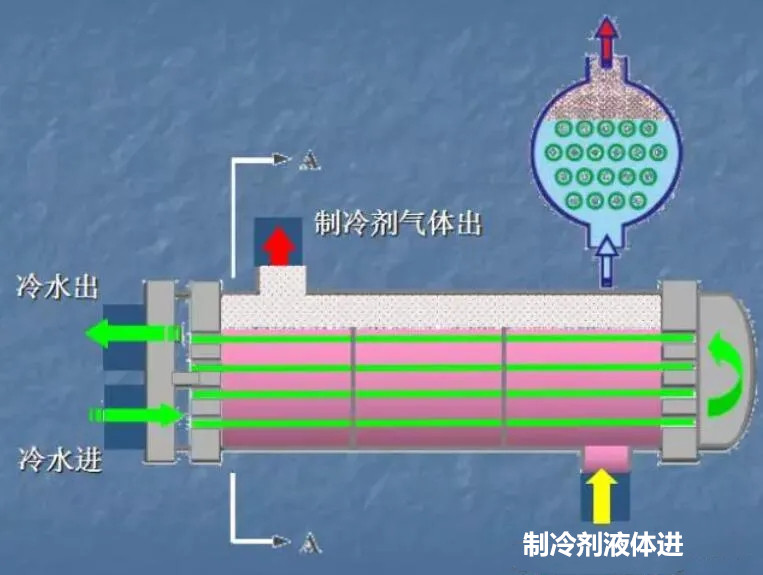 “滿液式”是指機(jī)組的“殼程”內(nèi)走制冷劑循環(huán),“管程”內(nèi)走冷凍水循環(huán),從剖面上看,就好像是筒體里有大半筒制冷劑,而走水的管束浸泡在制冷劑里。它和“干式蒸發(fā)器”剛好相反,干式的是“管程”走制冷劑,“殼程”走水,好比制冷劑管束浸泡在水里。