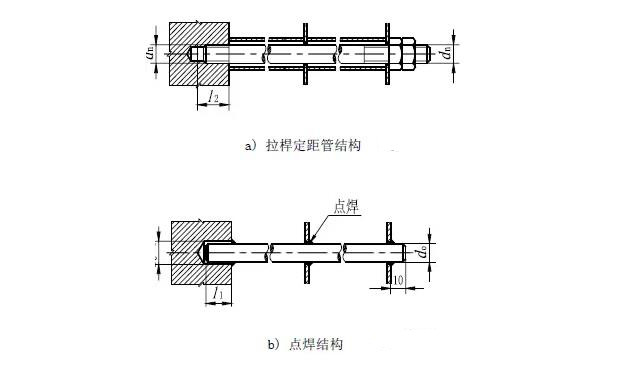 拉桿定距管結(jié)構(gòu),用于換熱管外徑大于或等于 19mm 的管束。拉桿與折流板點(diǎn)焊結(jié)構(gòu),用于換熱管外徑小于或等于 14mm 的管束。
