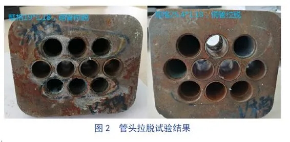 (2)第一種工藝失敗后,我們又進(jìn)行了管板開槽(國(guó)標(biāo)363標(biāo)準(zhǔn)槽)但管頭不涂抹密封膠水的脹接試驗(yàn)。同樣管板厚度32mm,銅管規(guī)格一組為 19×1.18mm,一組為 25.4×1.18mm,脹接長(zhǎng)度比管板厚度小3毫米。脹接減薄率實(shí)際測(cè)量在6%~7.5%之間。脹接完以后,待密封膠水達(dá)到2小時(shí)的固化時(shí)間以后,分別對(duì)兩組容器進(jìn)行氣壓試驗(yàn)檢漏(壓力3.22MPa),兩組管頭同樣都出現(xiàn)多根泄漏,無(wú)法保證脹接密封性。