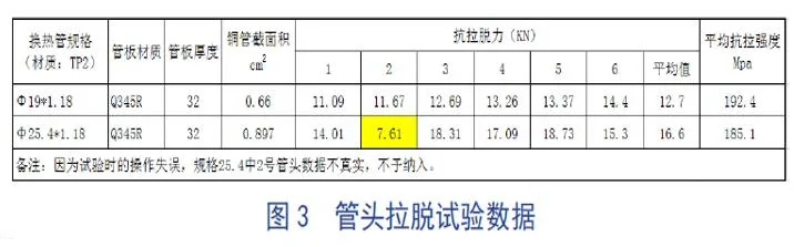 最后,為了驗(yàn)證管子的抗拉脫力,我們按照上面的第三種脹接工藝做了脹接試件進(jìn)行抗拉脫試驗(yàn),試驗(yàn)結(jié)果見圖2(由于操作原因,每種規(guī)格只測(cè)了其中6個(gè)),試驗(yàn)參數(shù)見圖3。試驗(yàn)結(jié)果完全滿足強(qiáng)度脹接抗拉強(qiáng)度大于等于4MPa的要求。